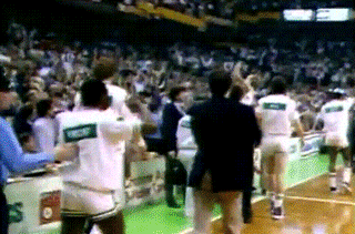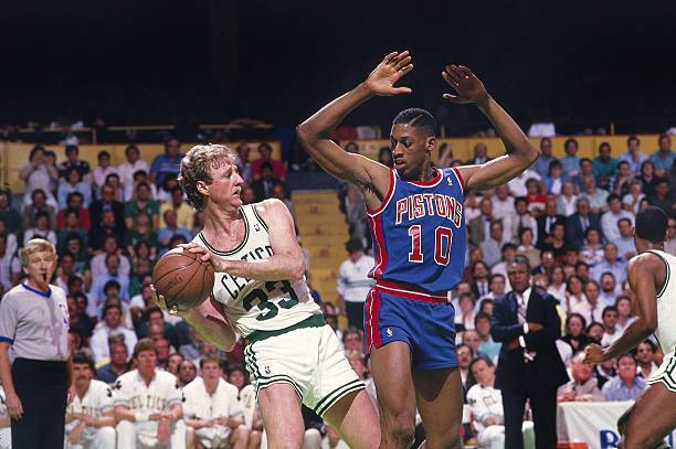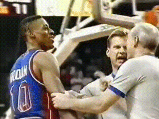 래리 버드의 슛을 로드맨이 블로킹 한 후 피스톤즈의 볼이 선언되자 좋아하는 로드맨