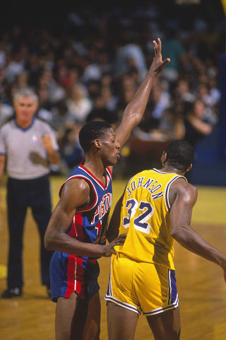 June, 1988 NBA Finals 에서 매직 존슨을 수비하는 로드맨. 하지만 레이커스에 3승4패로 우승 문턱에서 주저앉고 만다.