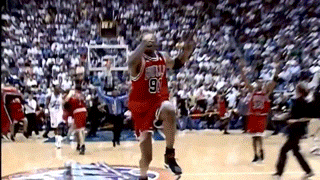 June 14, 1998 NBA Finals Game6, 극적으로 우승이 확정되는 순간 방방 뛰며 기쁨을 감추지 못하는 로드맨